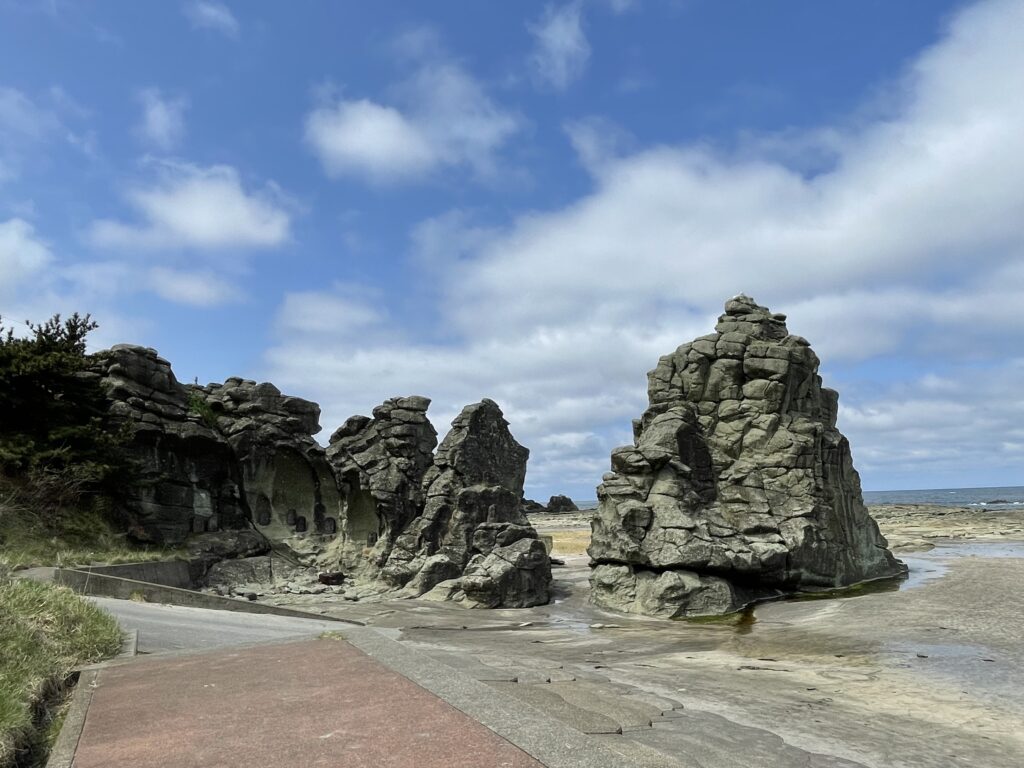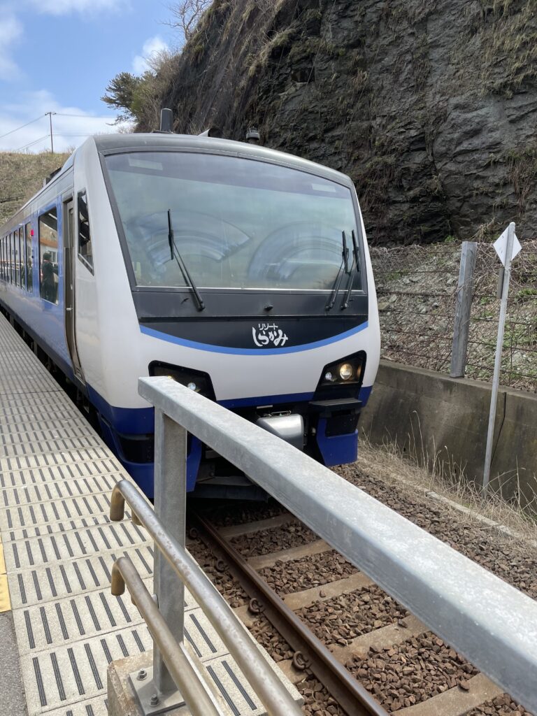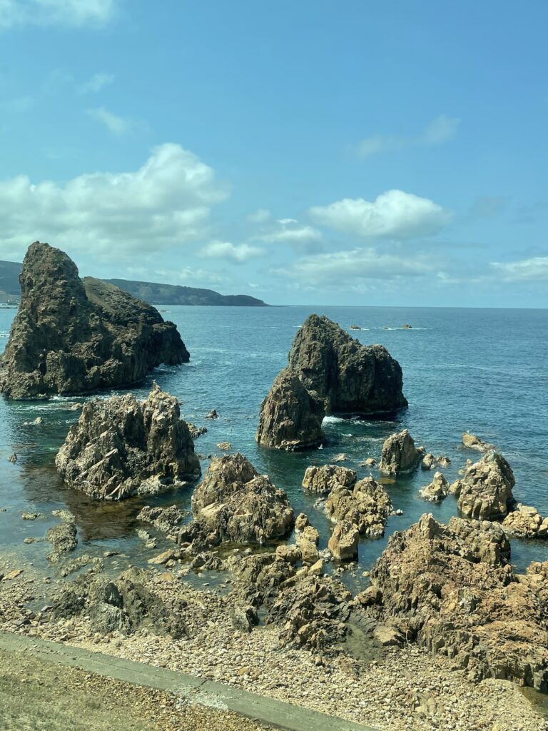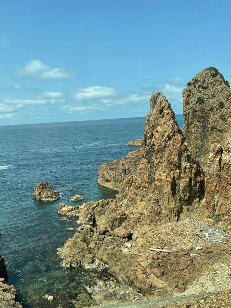 弘前から秋田までの4時間41分。途中これがスイッチバックかぁなどと思いながらまだ花の咲いていないりんごの木を眺める。1時間ほど経つと海岸線が見えてきた。太平洋側とはまた雰囲気が違う。奇岩が次々と現れ、見入ってしまった。