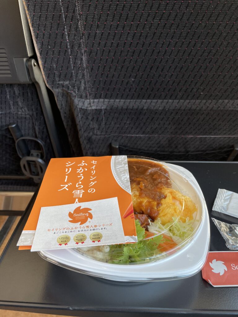 実は、昨日買ったアップルパイをリゾートしらかみ内でまた一つ食べてしまった。とはいえ、そろそろ小腹が空いてきた。10:55 深浦駅に到着。4分ほど停車するので急いでホームに降り、事前予約していたセイリングのふかうら雪人参ビーフシチューを受け取る。温かい食事は嬉しい。