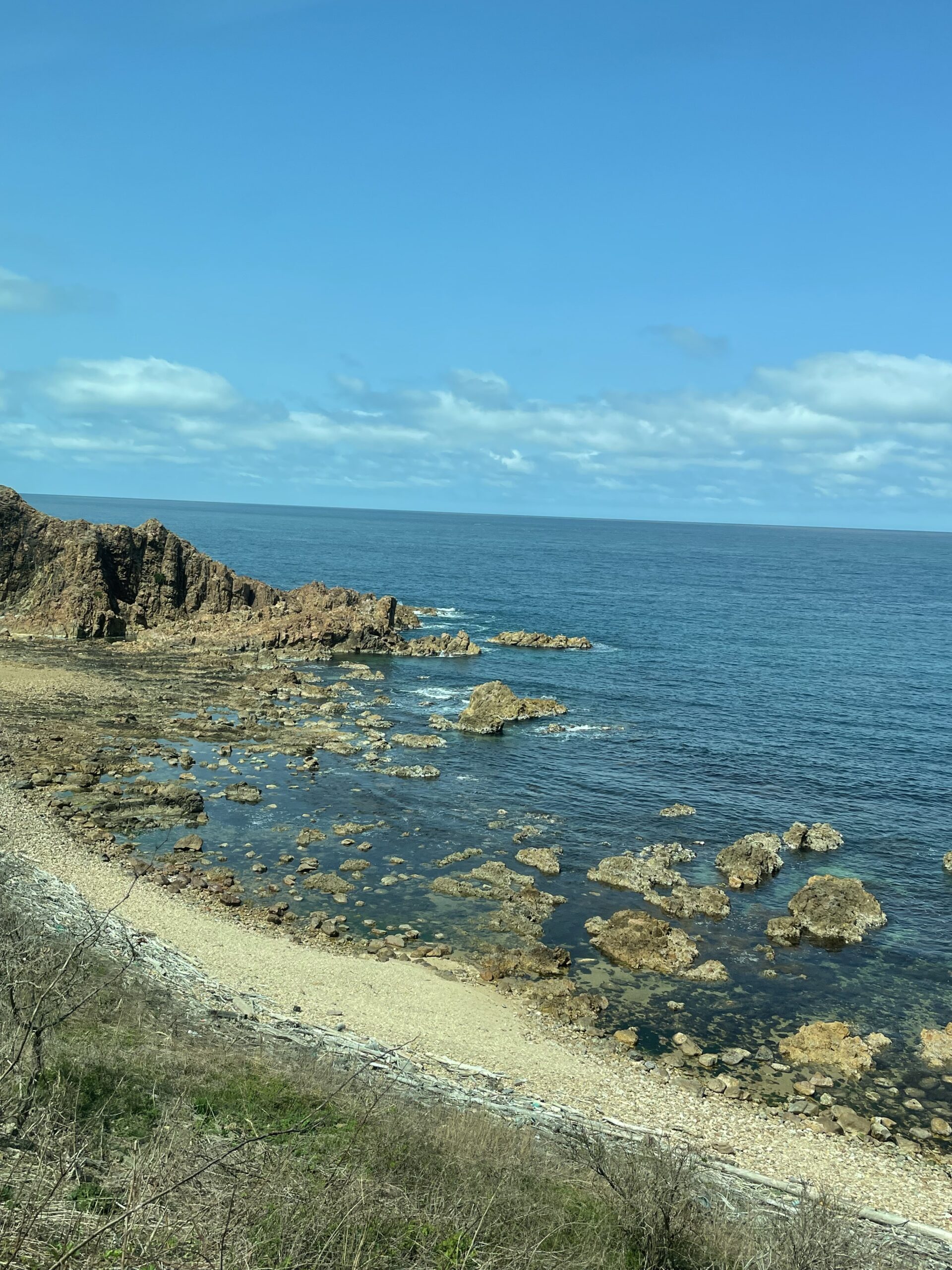 弘前から秋田までの4時間41分。途中これがスイッチバックかぁなどと思いながらまだ花の咲いていないりんごの木を眺める。1時間ほど経つと海岸線が見えてきた。太平洋側とはまた雰囲気が違う。奇岩が次々と現れ、見入ってしまった。