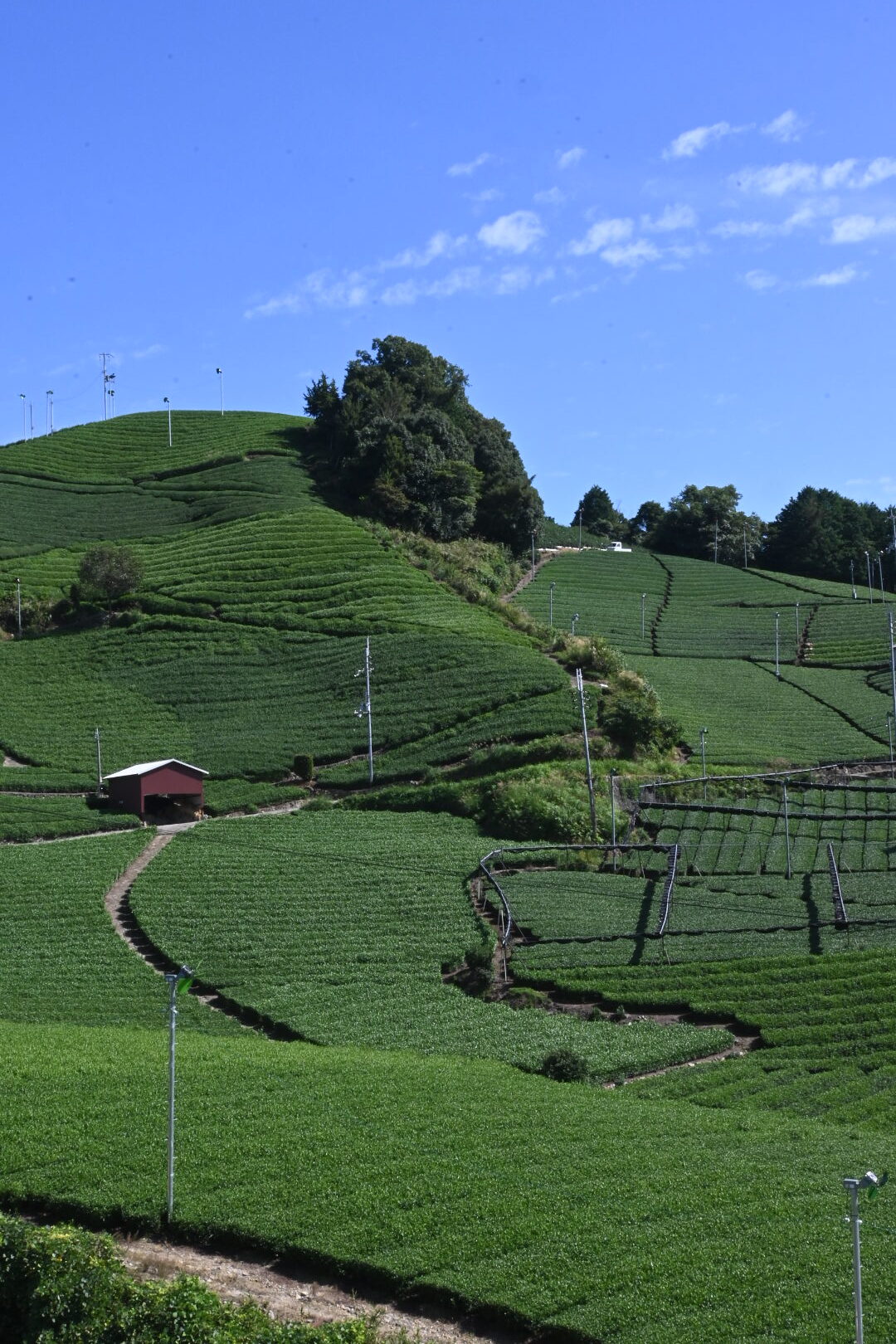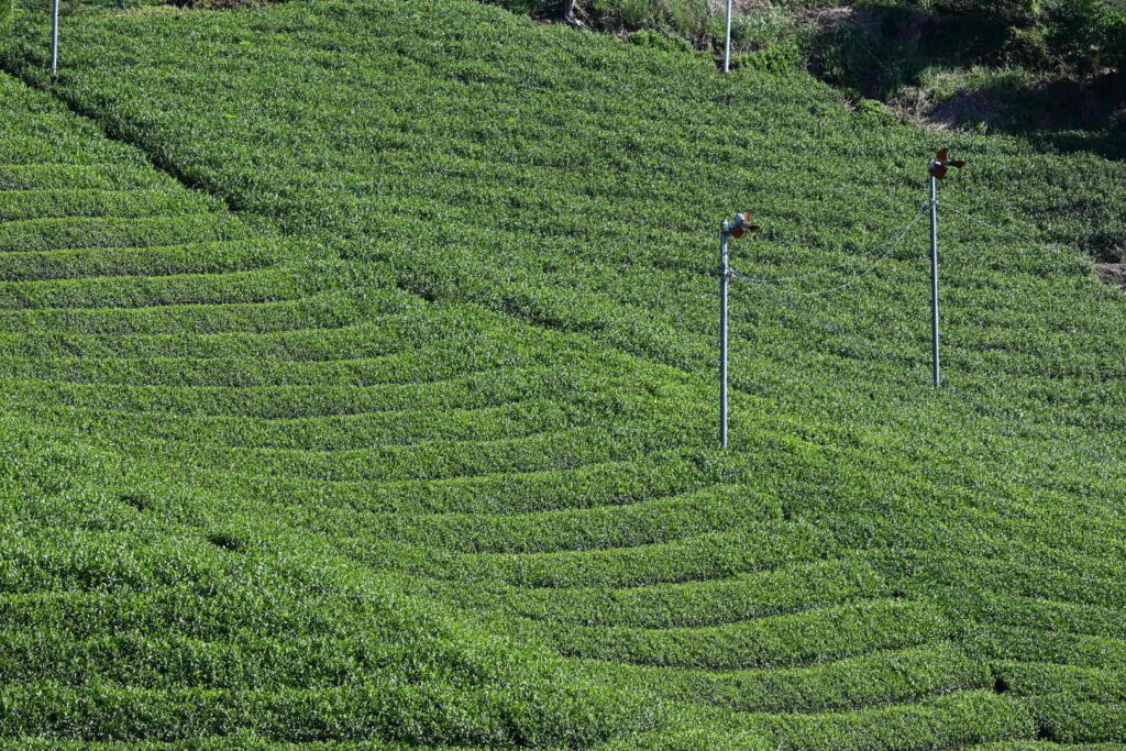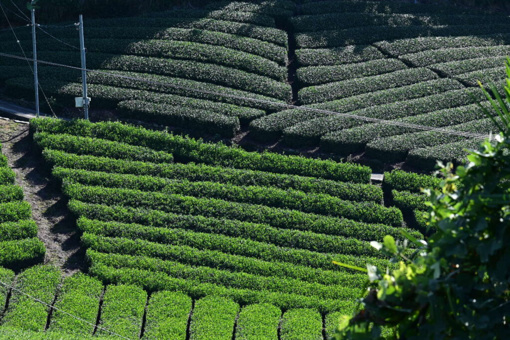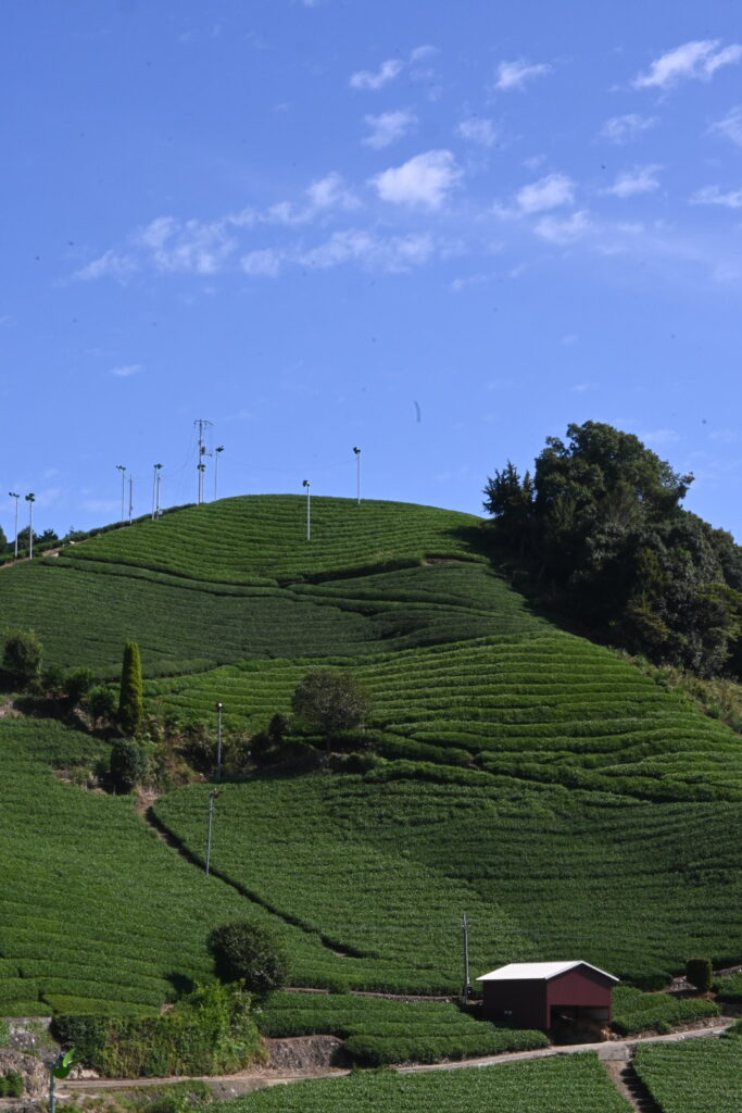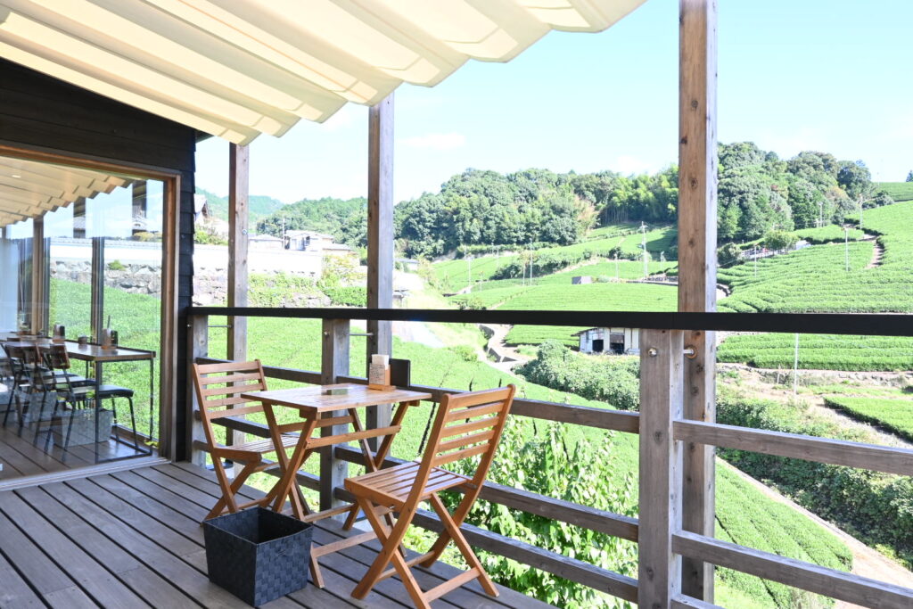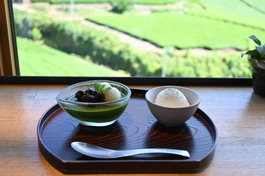 いくつかの乗り継ぎや路線バスを経て、和束町は石寺の茶畑までやって来た。京都府最大のお茶の産地だ。バス停から急傾斜の道を上ること約10分。見渡す限り一面の美しい茶畑が広がる。縞々が縦に横に斜めに、パッチワークの芸術品のよう。坂を上がったところで、『dan dan cafe』というオシャレなカフェがあるので、ここで一息。もちろんお茶を使ったスイーツを注文。
