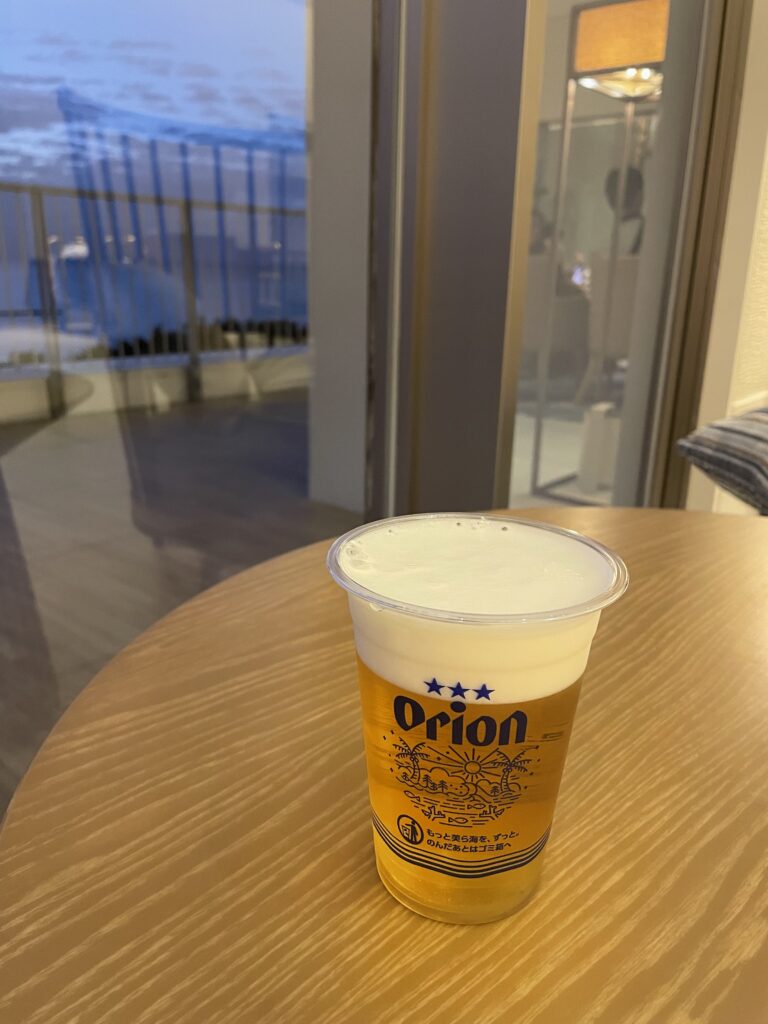 ウェルカムドリンクはオリオンビール。大浴場は2億年以上前の地層から湧き出る天然温泉だった。