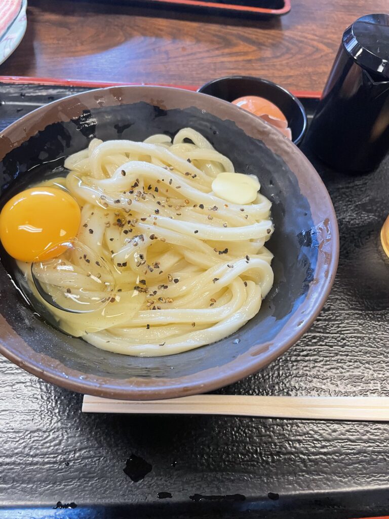 まず1軒目は、テレビで見かけた「うどんバカ一代」。6:30に店の前に着いたのに長蛇の列。恐るべし。30分ぐらい並んだかな。注文方法はお店ごとに違うというのでドキドキしたが、前の方に倣えば、まあなんとかなる。「釜バターうどん」を注文。