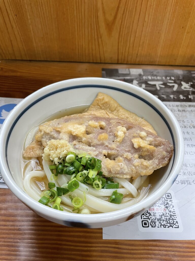 2軒目は、琴平電鉄長尾線と予讃線を乗り継ぎ、坂出へ移動。途中遍路道などもあり、四国を旅しているのを実感。15分ほど歩いて「山下うどん」へ。こちらも列が。注文方法は前に並んでいる方に倣って、出汁を自分で入れるのね、と。蓮根の天ぷらなども付けて。ああ、讃岐うどんのハシゴをしている!旅の目的半分達成。